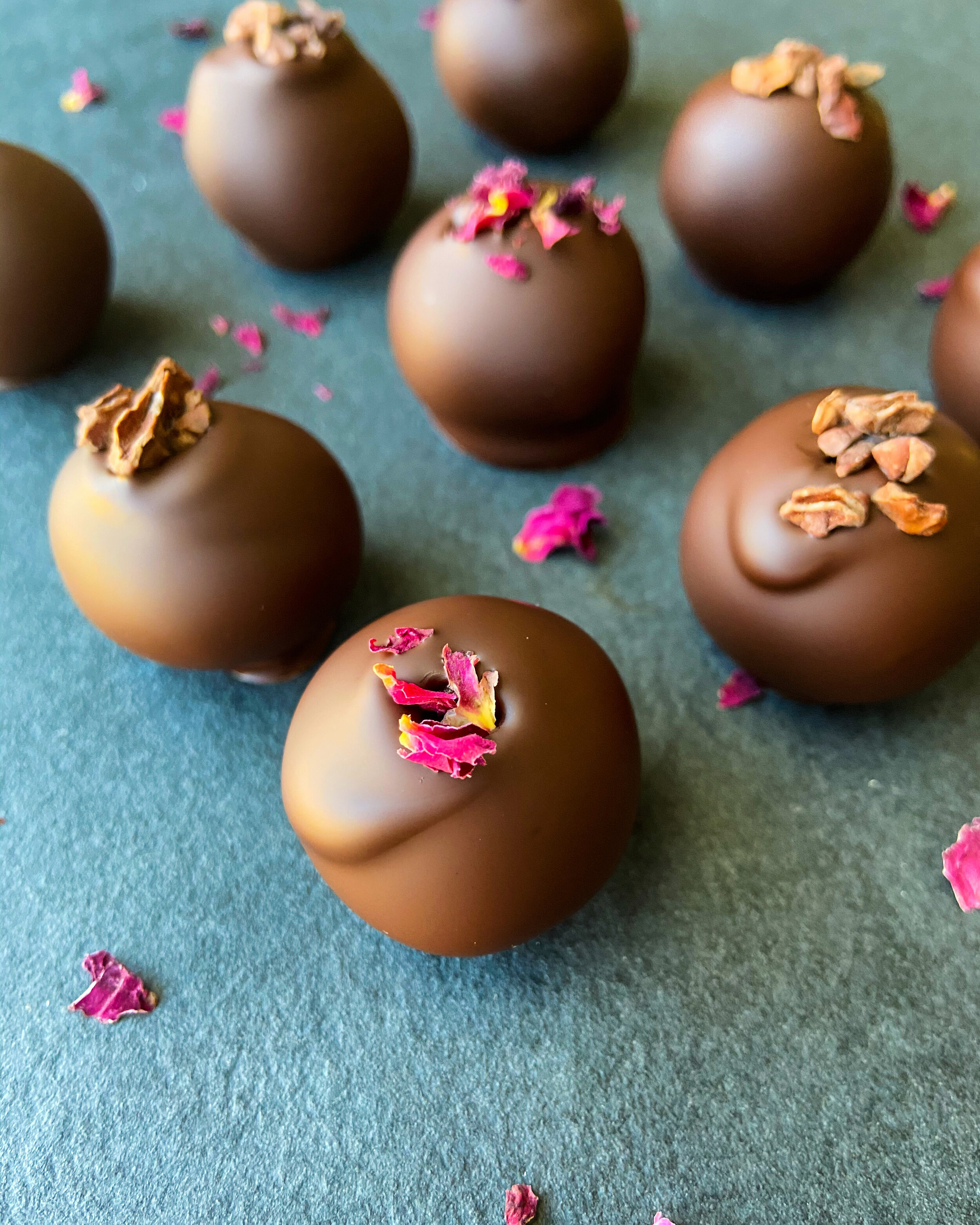 Rose petals, cacao nibs, dried raspberries or coconut flakes for garnishing.
