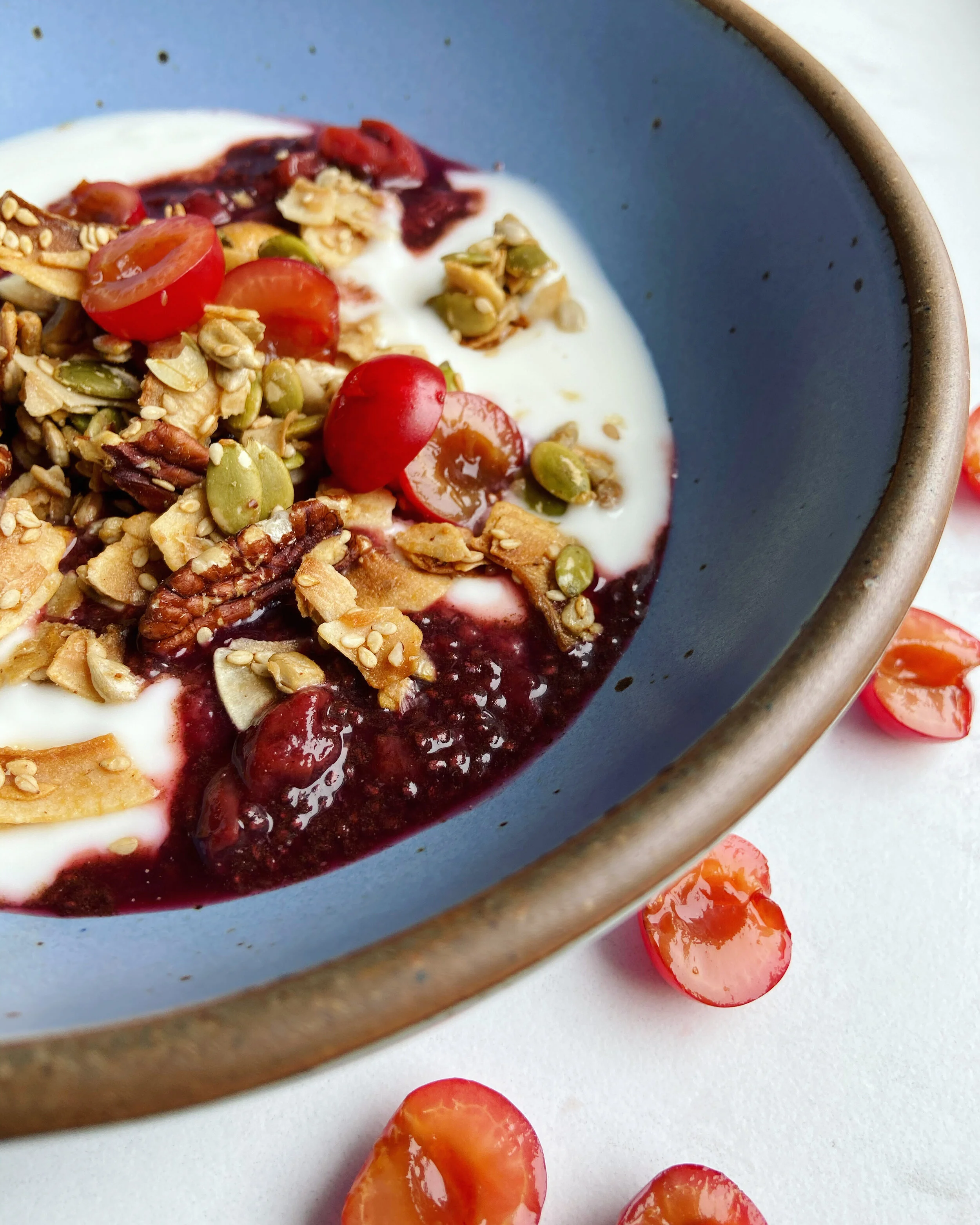 At ALKAME CO we like to make herbs fun, tasty and easy to incorporate into your daily routines. This sour cherry and chia compote featuring our MOOD NECTAR formula does just that.